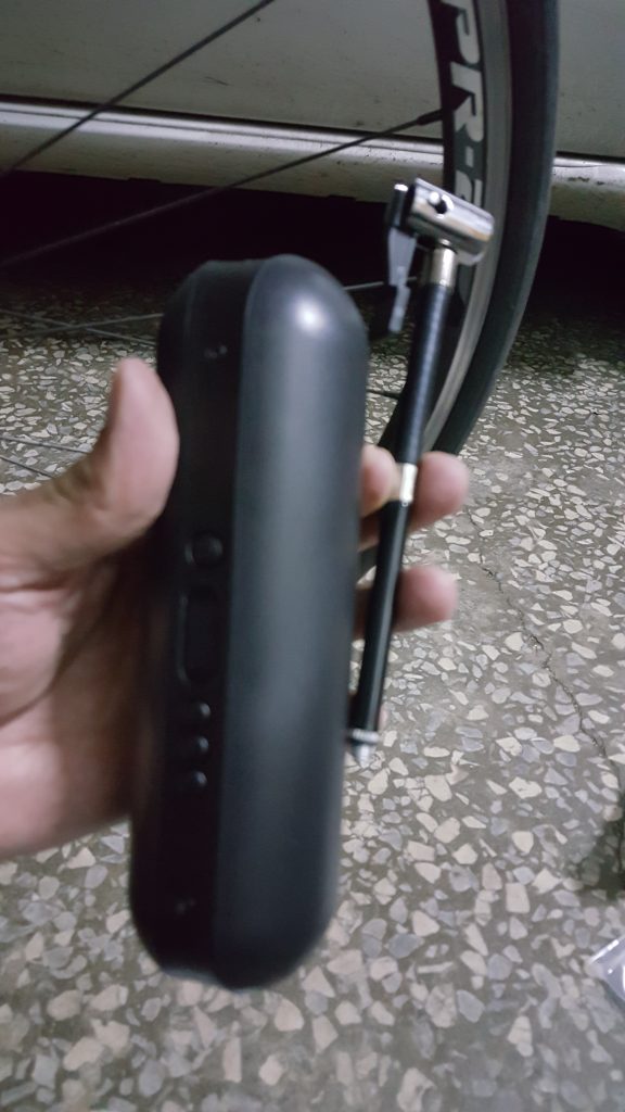 開始打氣,花一些時間緩慢的打上高壓,設定90psi,到93psi 時自動停止,完畢拔開氣嘴時也沒聽到傳統打氣機的氣嘴洩壓聲,這現象怪怪的之後再觀察update,其實用傳統的打氣筒速度比較快,畢竟氣缸也較大,但這支小小的確實適合攜帶,且也省力。