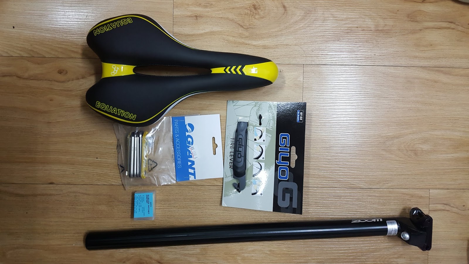 同學之前給我一台青少年車(Giant YD499),因為女兒國小四年級了調至最低卻還是採不到地,於是我暫時載到公司當跑步時移動到河堤的通勤車使用,但這台對我來說太矮了,坐墊也不舒服,於是興起購買個長座管與坐墊來替換的念頭。