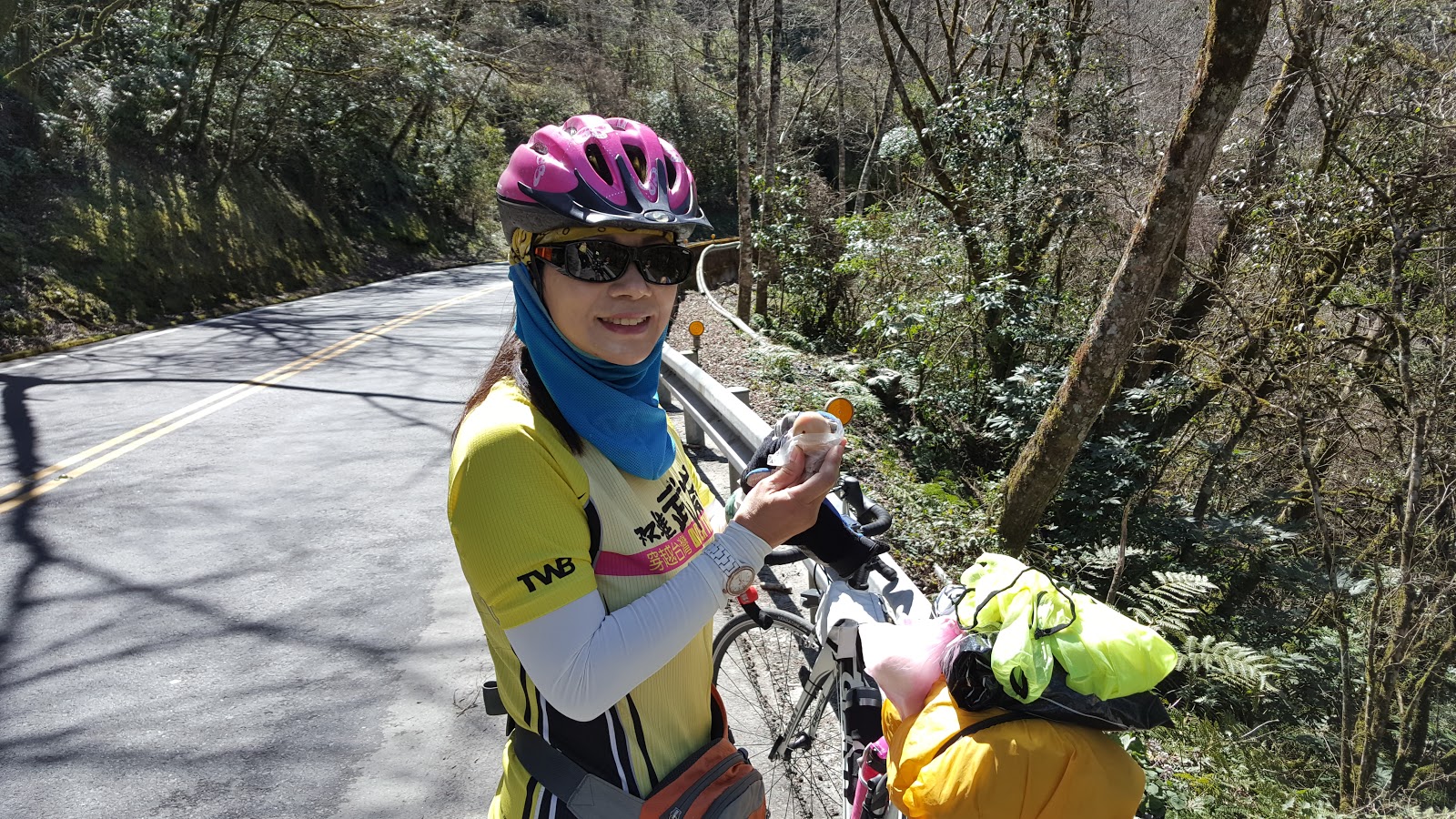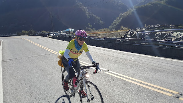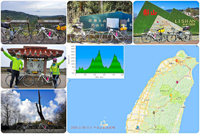 3年前塩滿姐退休聚餐時我們開玩笑的送了她一張三橫一豎挑戰地圖,沒想到這次陪她完成這一豎-中央山脈大縱騎,我們花了四天自助旅行方式完成全長503kM, 總爬升10097M的路線,由新莊走北宜公路到宜蘭再接台7、7甲,沿途經四季、南山、武陵農場,再接台8經梨山、台14大禹嶺上武嶺,線道131埔里-水里,台16、台21信義鄉、台18阿里山公路一路騎到嘉義,這路線也許對年輕人不難,但塩滿姐即使退休仍持續挑戰,我一路看她奮力踩踏向上真是感動不已,一個人旅行也許輕鬆自在,但兩個人可以互相聊天鼓舞,讓旅途增添不少精彩回憶,感謝一同旅途的夥伴。