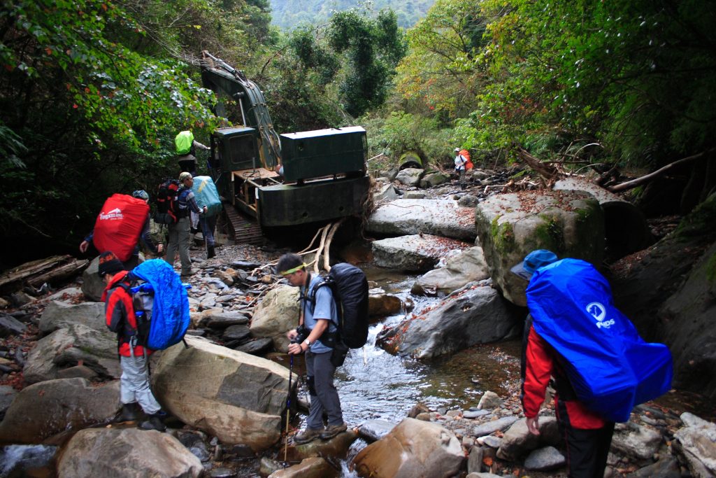 拜雪隧的開通往來宜蘭省了不少時間,之前看其他行程都是前一天先到思源啞口過夜一大早再出發,我們是當天早上5:00 中和集合,5:30 搭乘19人中巴出發,8:45 抵達台七線思源啞口,先整裝及分配公糧,因為背了帳篷,整個背包大約30KG,這次可能帶太多東西了吧,換洗衣物也帶了蠻多套,怕下雨沒得換,還帶了一些水果,背包重到連上肩都有點困難,這是我第一次背那麼重阿。