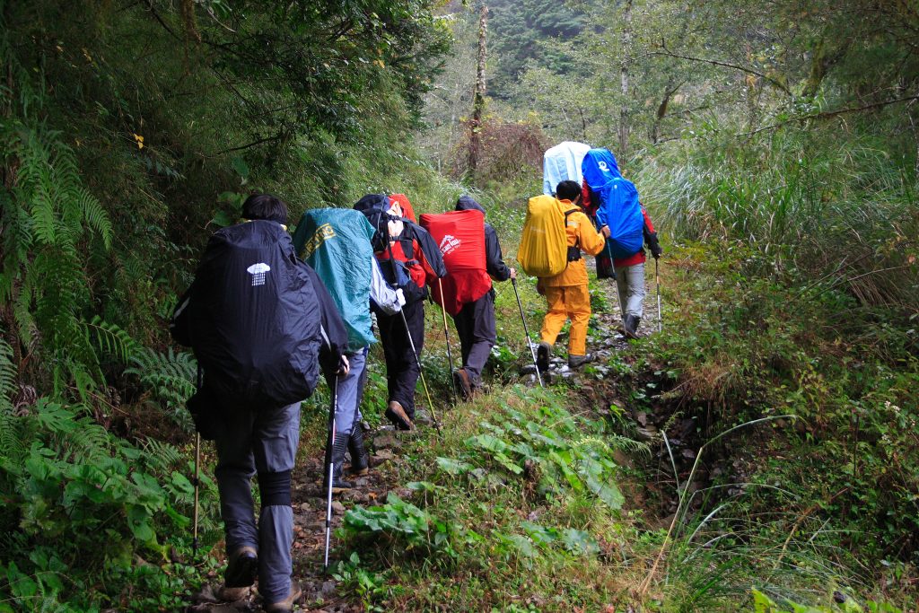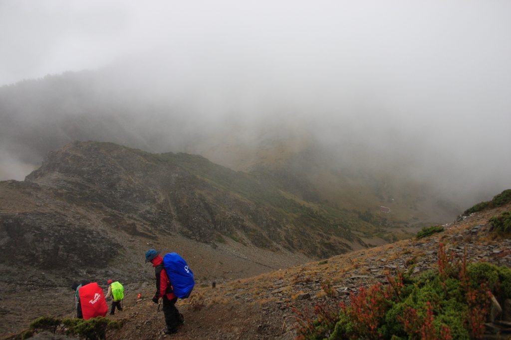 當年登山經驗不足還在磨合裝備,前一趟畢羊帶得太少冷到,所以這趟帶比較多東西,四套衣服,五顆芭樂,還背著7.5KG露營用帳篷要上南湖山屋露營總重約30Kg吧,第一天走到新雲稜山屋時已經快虛脫了,還好第二天聽說其他隊都不上去了所以馬上輕量化,把帳篷與衣物留在山屋內,但敗筆是當時沒穿上雨褲,經過整天雨中行走雨水慢慢滲入把登山鞋弄濕,造成隔天雪中行走腳凍傷了,還好沒在這風雨中搭帳篷~