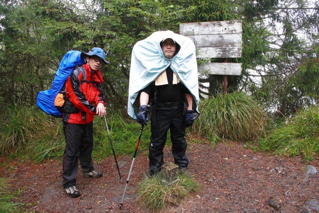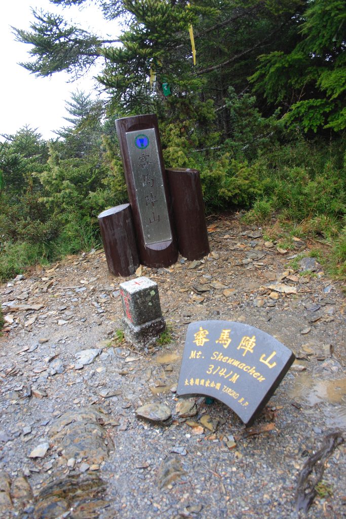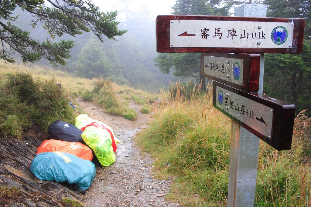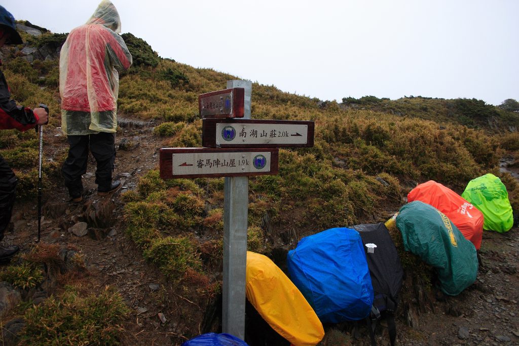 10:34 抵達審馬陣山 海拔3141M,此行第一座百岳,拍完登頂照大家又一陣驚呼,狂奔下山背起大背包保暖,因為淋雨全身溼透非常的冷,放下背包後覺得更冷,這是第一次覺得大背包是甜蜜的負擔阿。在這邊陸續碰到由南湖山屋撤下來的隊伍,約20幾人,他們原本還要在山上待一天,因為下雨所以提早下山,心想還好碰到下雨,今天應該也有山屋可睡了,看來把背包留守在雲陵是賭對了。