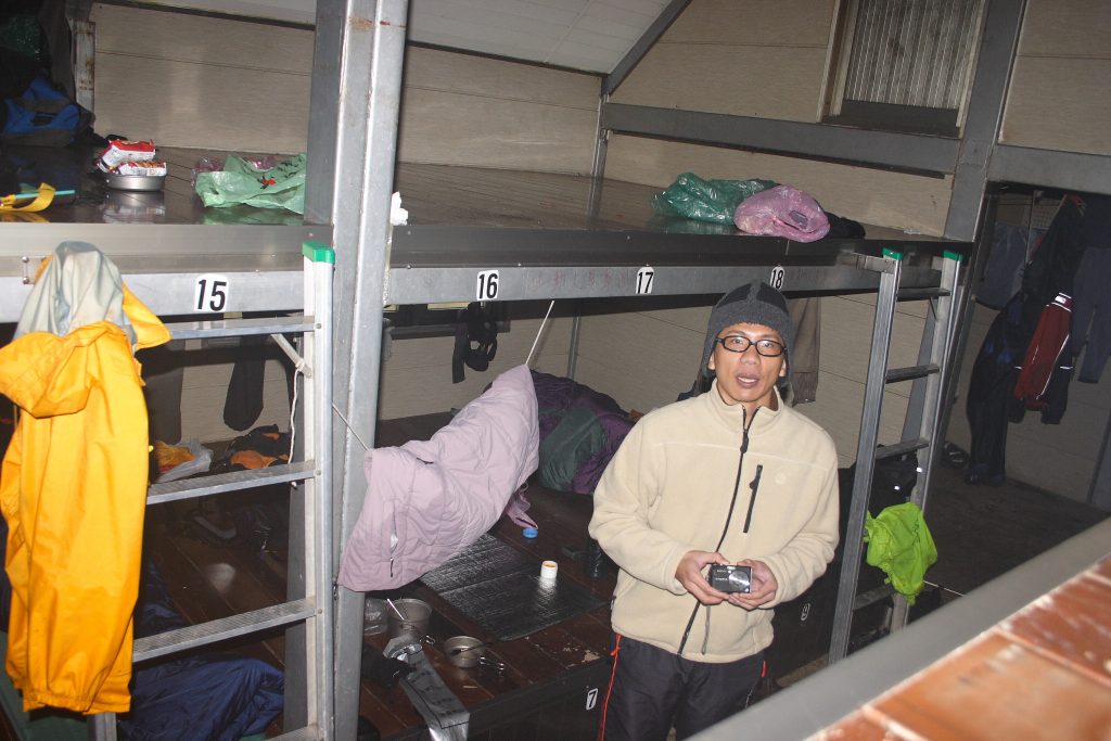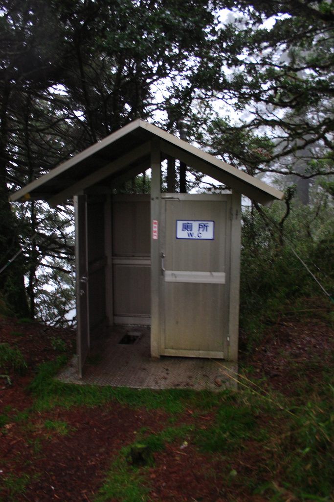 16:56 下到木杆鞍部,海拔2535M,到新雲陵山莊剩0.6KM,不過這0.6KM 卻是最漫長及痛苦的一段,從這邊開始就是一段爬坡,加上天色已晚,又下著雨,只能邊走邊休息,靠著精神力量一步一步慢慢的前進,後悔自己真是不自量力,看來以後負重應該控制在25KG以下,以免整路都是痛苦的回憶,最後於17:15終於抵達山莊,海拔約2600M,都走到摸黑了,新雲陵山莊,GPS地圖上竟然還沒有,山屋旁有雨水儲水桶,旁邊也有廁所,算是五星級的了。還好山莊內好心的山友幫忙挪出位置,有山莊睡比搭帳篷好上太多了,下雨天又那麼冷真慶幸沒用到帳篷,在山莊內與今天剛登完頂回程的山友聊到原來前幾天都是好天氣,從今天才開始變天,這種天氣上去會看不到風景的,嗚…我們怎麼每次都碰到下雨阿。原本在山屋的另一隊約22人他們預計凌晨2:00就要出發了,結果睡夢中聽到他們嚮導宣佈因為持續下雨所以取消了,反正上去也看不到風景,此時心情確也在偷偷暗爽,既然他們不上去那應該少了搶山屋的對手吧,我們應該可以不用背帳篷上去了吧。