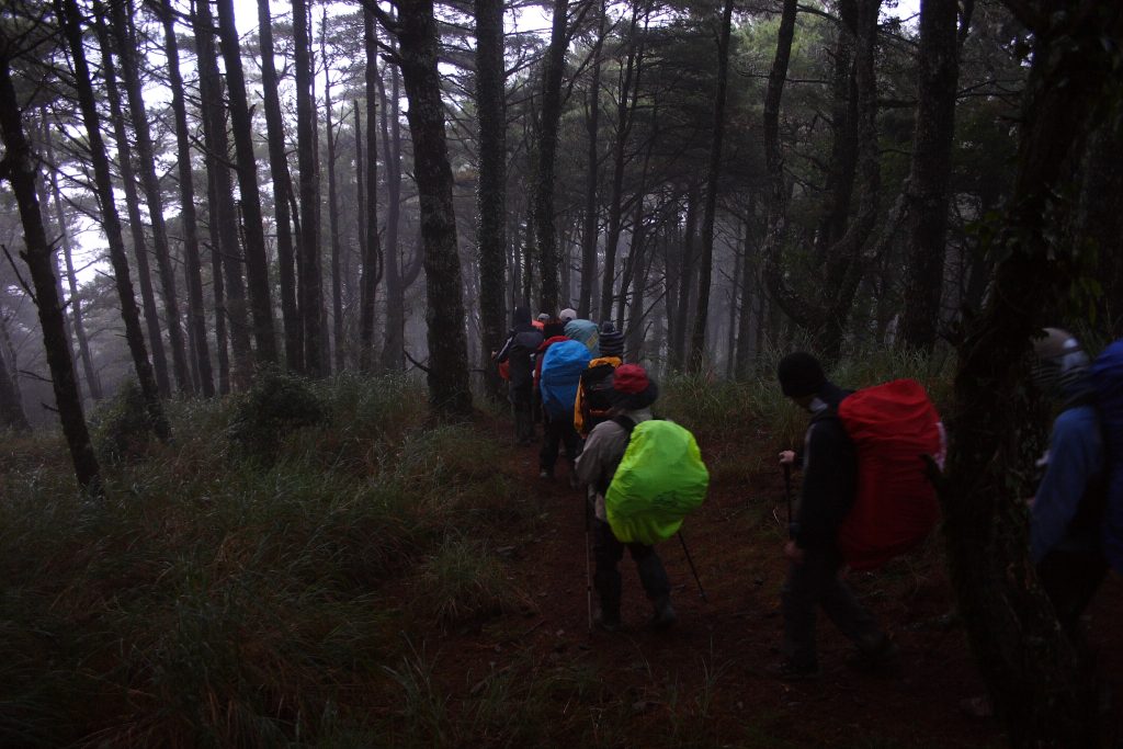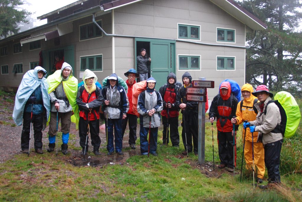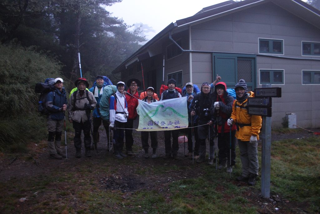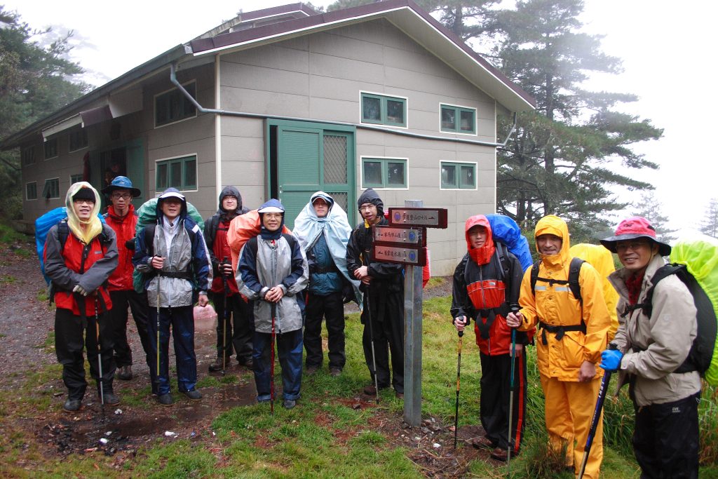 6:12 用完早餐整裝準備出發回程,爬山就是這裡累,漫漫長路上山後,重點是還要留點體力下山阿,拍照時山莊內其他隊說前天看我們下雨要出發時大家臉上都帶有愁容,好像壯士一去兮不復返,今天回程終於露出笑容了