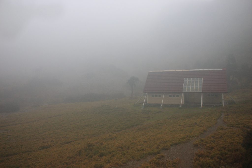 快到了快到了,已經看到山屋了,不過這邊風真的很大,下坡時一陣冷風迎面吹來竟然我的下巴冷的抽經了,加上風太大把我的背包套吹下來,又下著雨,害我只好一路跑下去阿