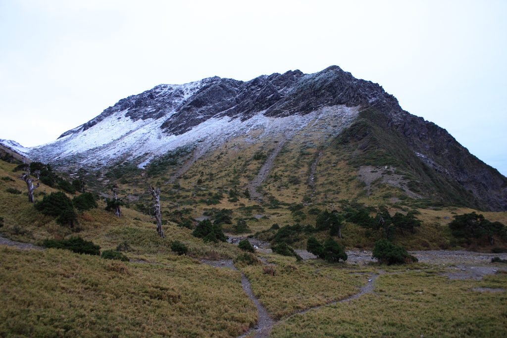 清晨天還沒亮,看到外面主峰山腰白白的還想說是不是雲,還是霜,遠方依稀可見雪山山頂也白白的