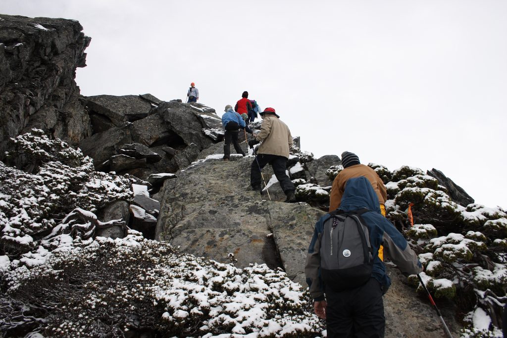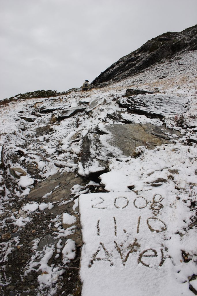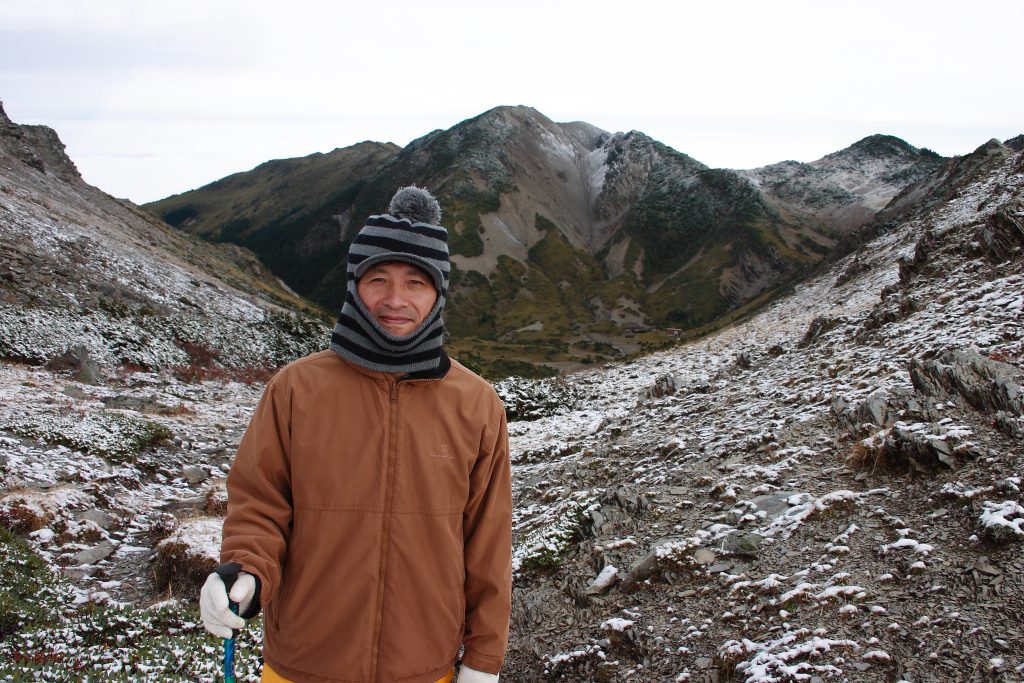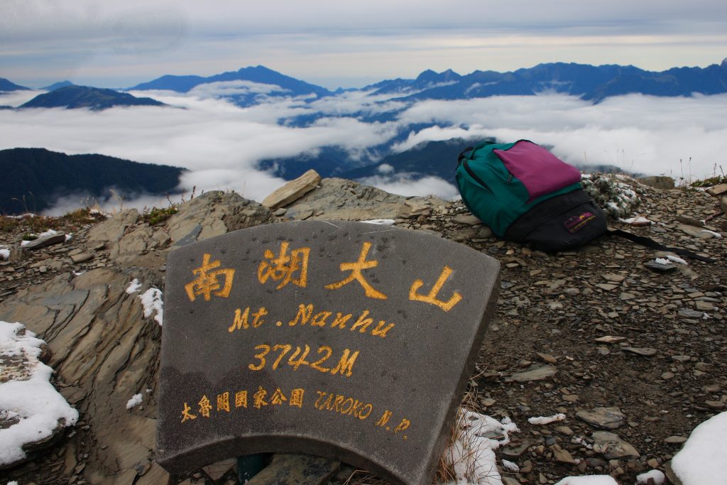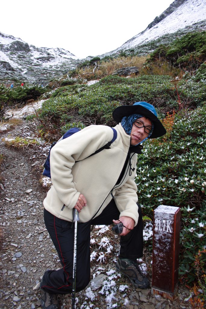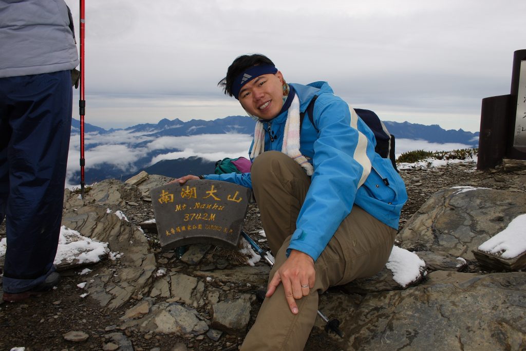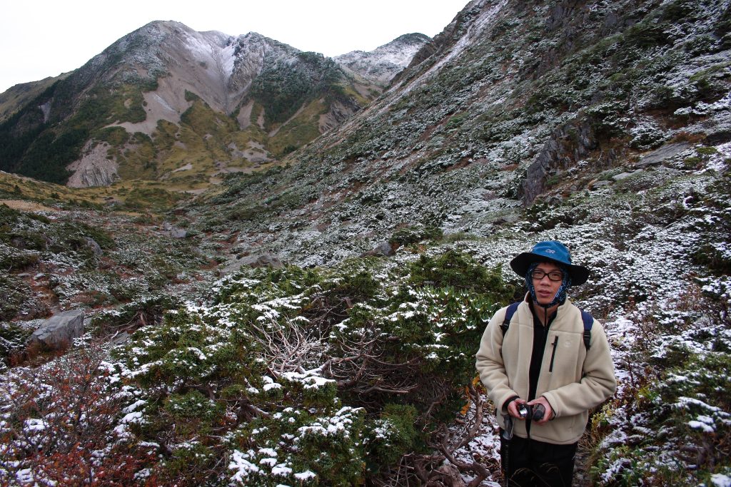 這年的南湖大山歷經很多苦難,第一天上到雲稜山屋後隔天要出發開始下雨,同山屋其他團紛紛放棄向上推進,只有鹽滿姐不輕言放棄仍然要繼續出發,離開雲稜時請山屋他團幫忙拍照,他們說我們表情就像要上戰場一樣壯士一去兮不復返….途中輕裝攻完審馬陣山與南湖北山冷的跑回找大背包, 第一次覺得背上背包真好才不會冷,風雨中爬過五岩峰還聽到濃霧下方傳來土石流的聲音,最後包場了南湖山屋,當晚風強雨烈風聲大到讓我們不敢走出去上廁所,隔天清晨發現降下入冬第一場雪,只有我們得以欣賞到這場雪景,其他隊中午後上來的雪都融化了,但因為前一天鞋子濕了在雪地中行走凍傷腳趾頭也讓我的腳麻了半年才好,真是美麗痛苦的回憶