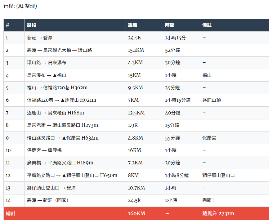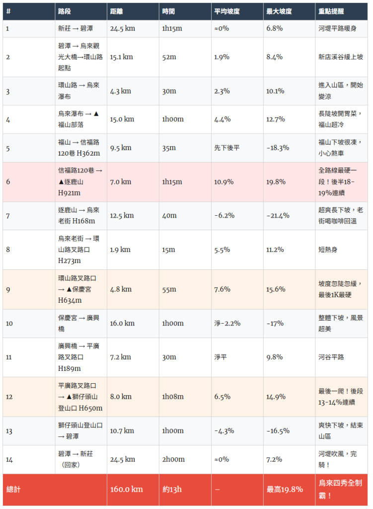 | 總計 | 160.0 km | 約13h | – | 最高19.8% | 烏來四秀全制霸! | |