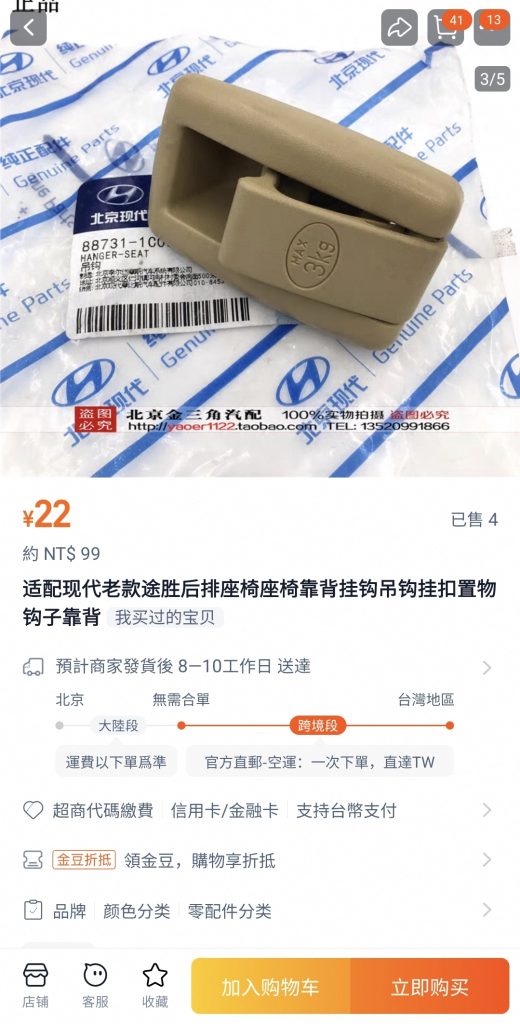沒想到能找到掛勾維修料,拜淘寶所賜可以買到大陸用料,可惜顏色不太對,台灣的車比較接近淺灰色?