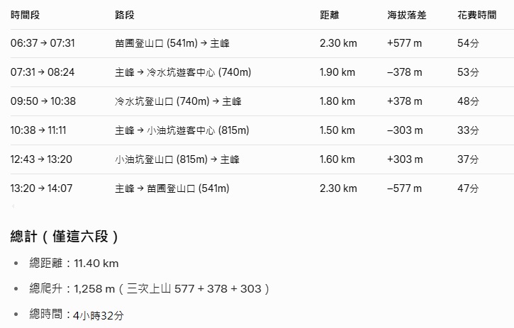 | 07:31 → 08:24 | 主峰 → 冷水坑遊客中心 (740m) | 1.9 km | –380 m | 53分 |
