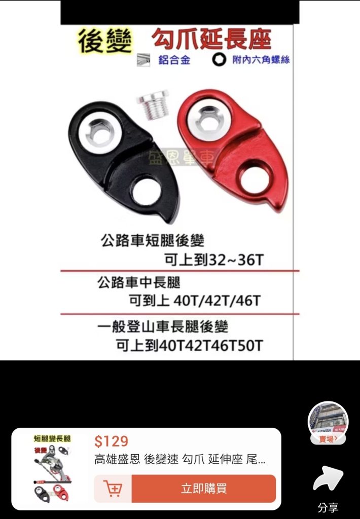 後來詢問AI 發現可以使用吊耳延伸座進行改裝,於是購買 11-34T 飛輪與吊耳來試試,一次攻頂到最高。